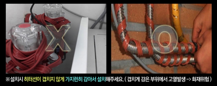 (X) 밸브·계량기에서 열선이 겹침 → (O) U자/지그재그로 모양 따라가되 겹침 금지
